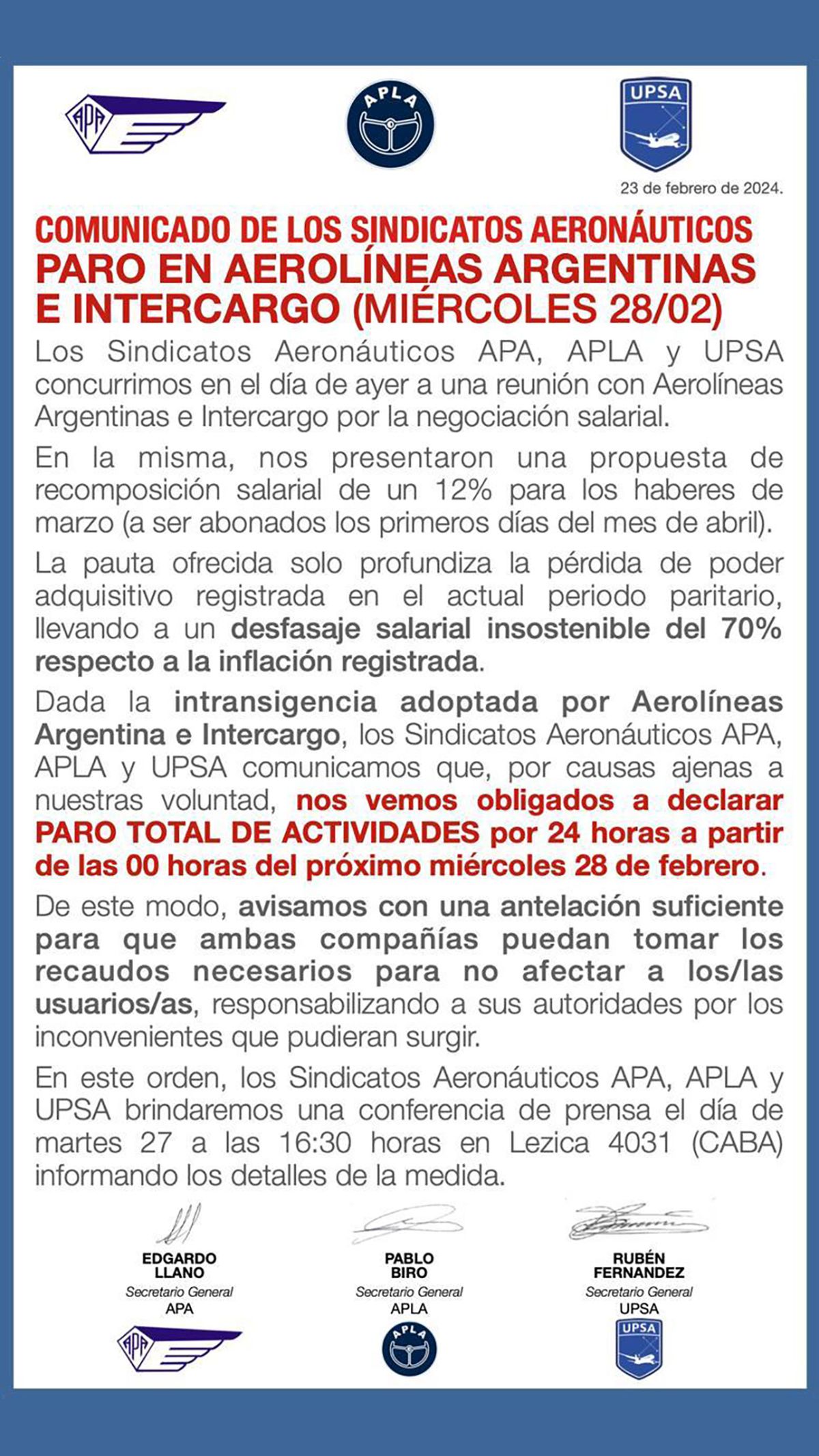 La decisión fue tomada por los gremios Asociación del Personal Aeronáutico (APA), Unión Personal Jerárquico (UPSA) y Asociación de Pilotos de Líneas Aéreas (APLA).