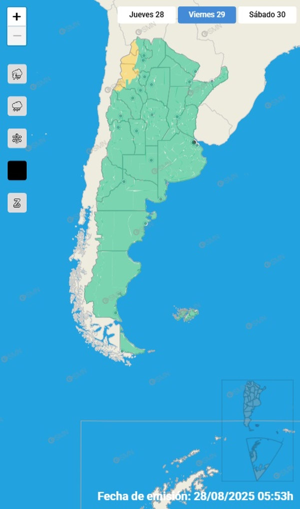 El Servicio Meteorológico Nacional emitió un alerta por la llegada de fuertes vientos en las provincias de Jujuy, Salta, Catamarca y La Rioja. El área será afectada por vientos del sector oeste con velocidades entre 45 y 75 km/h con ráfagas que pueden superar los 100 km/h, especialmente en los niveles más altos.