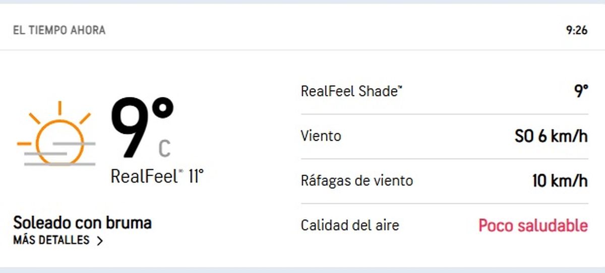 Según el pronóstico de Accuweather la calidad del aire tiene un estado peligroso que puede causar problemas en las personas. Los grupos sensibles pueden sentir inmediatamente los efectos sobre la salud. Las personas sanas pueden experimentar dificultad para respirar e irritación de la garganta tras una exposición prolongada. Limite sus actividades al aire libre.