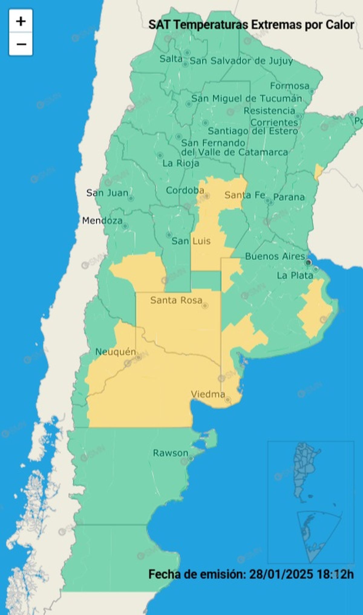 Según el Servicio Meteorológico Nacional, el centro de país se encuentra en alerta amarilla, este se verá afectado por temperaturas extremas en Córdoba, Buenos Aires, La Pampa, Río Negro, Neuquén y Mendoza.