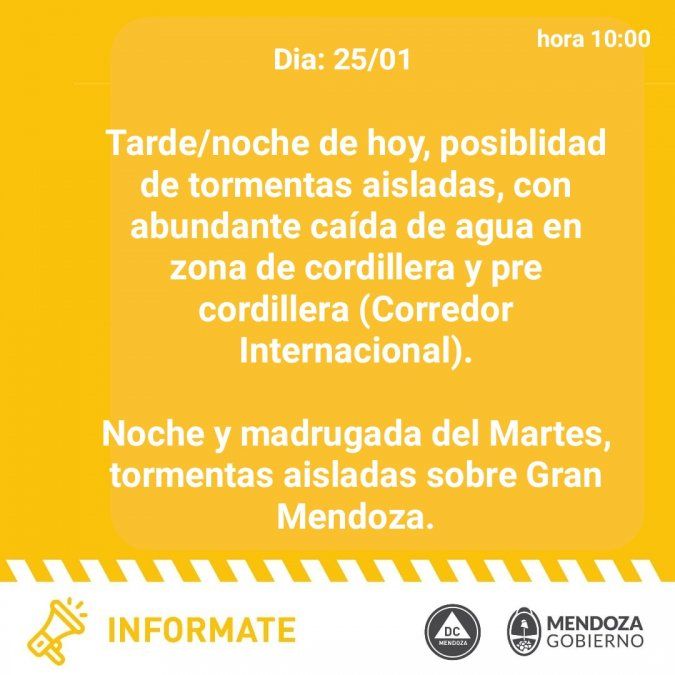 Defensa Civil emitió un alerta amarilla para Mendoza debido a la posibilidad de tormentas aisladas con abundante caída de agua.