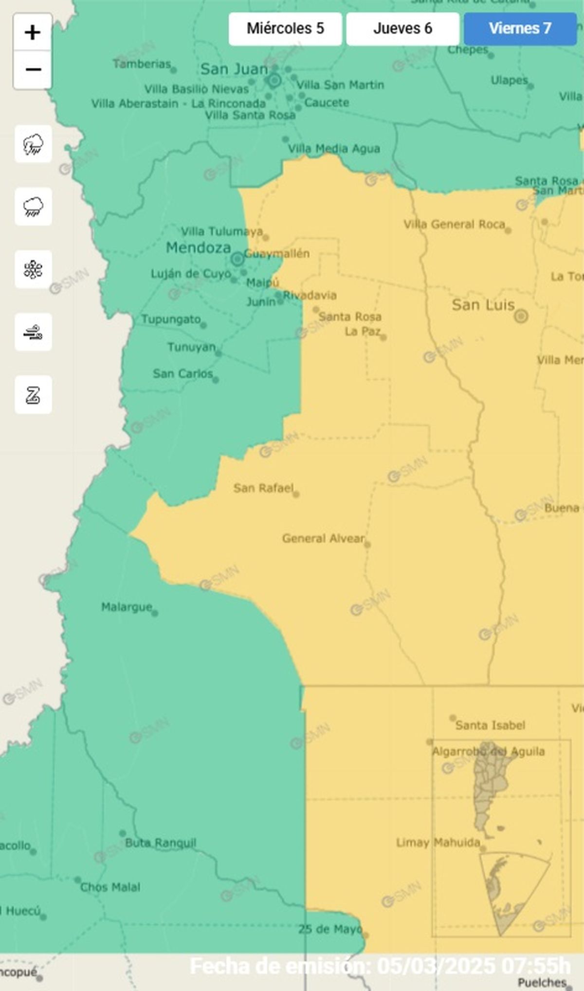 El Servicio Meteorológico Nacional compartió en su página oficial la alerta amarilla para la ciudad de Mendoza durante tres días. El área será afectada por tormentas, algunas localmente fuertes. Las mismas podrían estar acompañadas por abundante caída de agua en cortos períodos, intensa actividad eléctrica, ocasional caída de granizo y ráfagas superiores a los 60 km/h. Se prevén valores de precipitación acumulada entre 30 y 45 mm, pudiendo ser superados en forma puntual.
