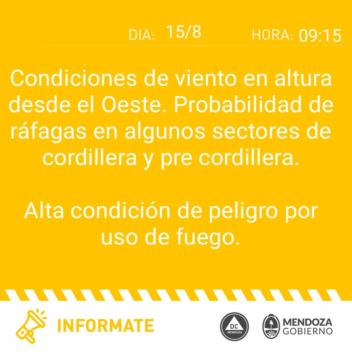 "Condiciones de viento en altura desde el Oeste. Probabilidad de ráfagas en algunos sectores de cordillera y pre cordillera. Alta condición de peligro por uso de fuego", dice el comunicado de Defensa Civil.