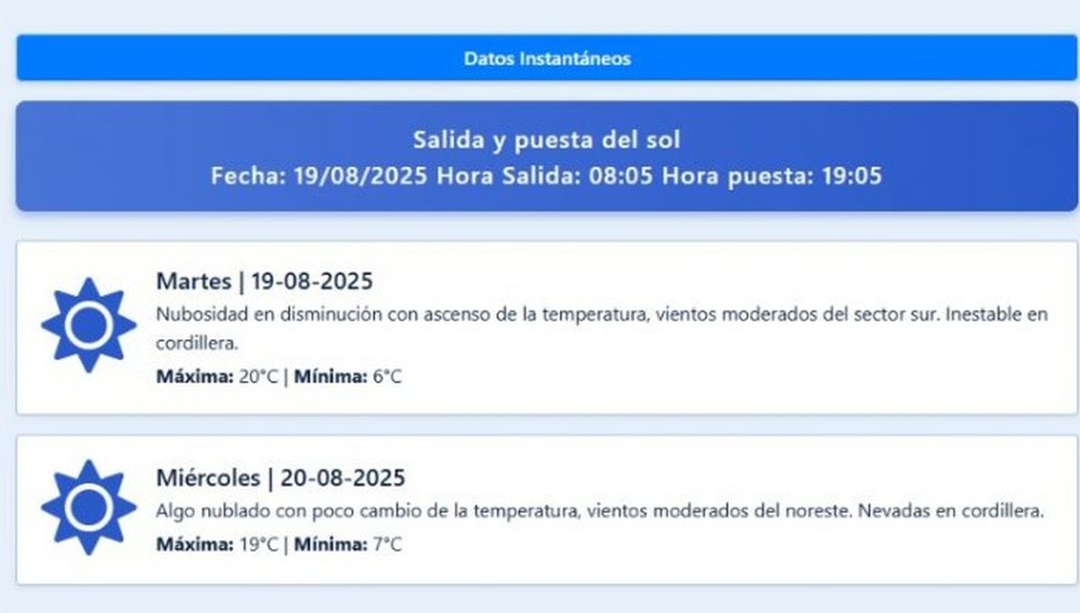 Este miércoles 20 de agosto también se espera una circulación de viento leve de norte a sur desde las 15 hasta las 22, que afectará a la zona Este, el Valle de Uco y la zona Sur. Viento Zonda leve en la zona oeste y la cordillera de Malargüe, desde las 23 hasta la madrugada del jueves.