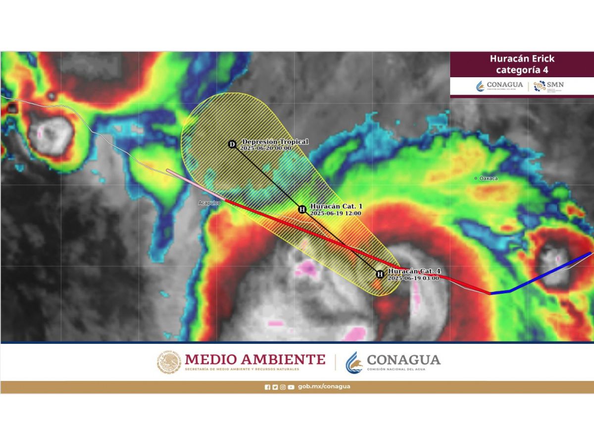 Según el gobierno de México, el centro del peligroso huracán Erick categoría 4 en la escala Saffir-Simpson, se localiza al oeste-suroeste de Oaxaca y al este-sureste de Guerrero. Sus bandas nubosas ocasionan lluvias puntuales torrenciales a extraordinarias en Guerrero, Oaxaca y Chiapas; intensas rachas de viento y oleaje elevado en sus costas.