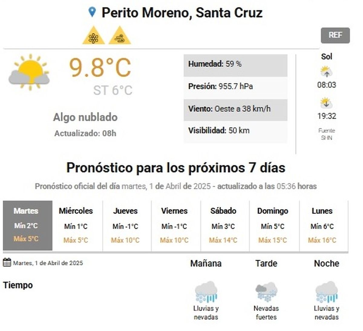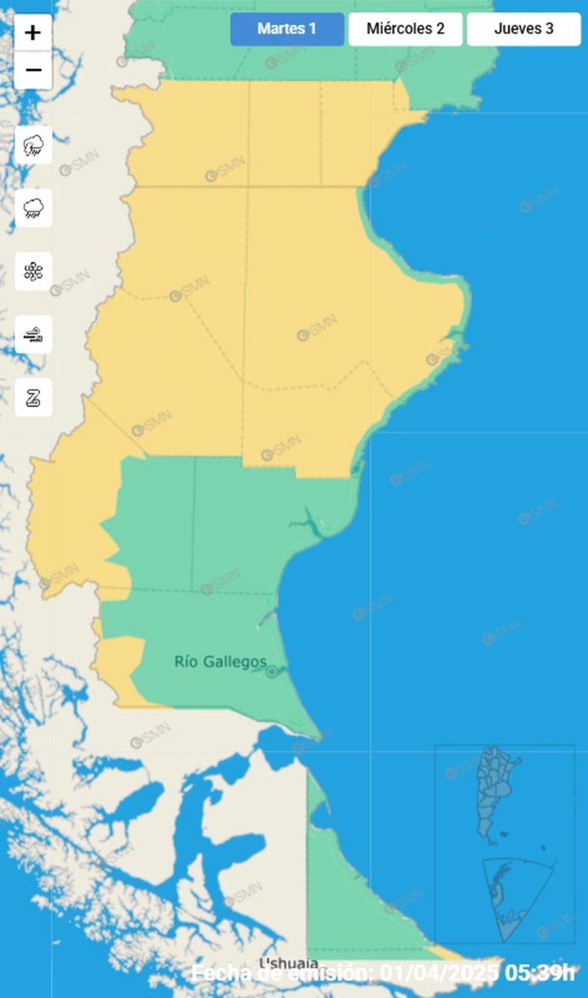 El Servicio Meteorológico Nacional emitió un alerta amarillo por la llegada de fuertes nevadas y vientos a las provincias de Santa Cruz, Chubut y Tierra del Fuego. El área será afectada por nevadas de variada intensidad. Se esperan valores de nieve acumulada entre 10 y 15 cm, que pueden ser superados de manera puntual. Por momentos, la precipitación puede ocurrir en forma de lluvia y nieve mezclada.
