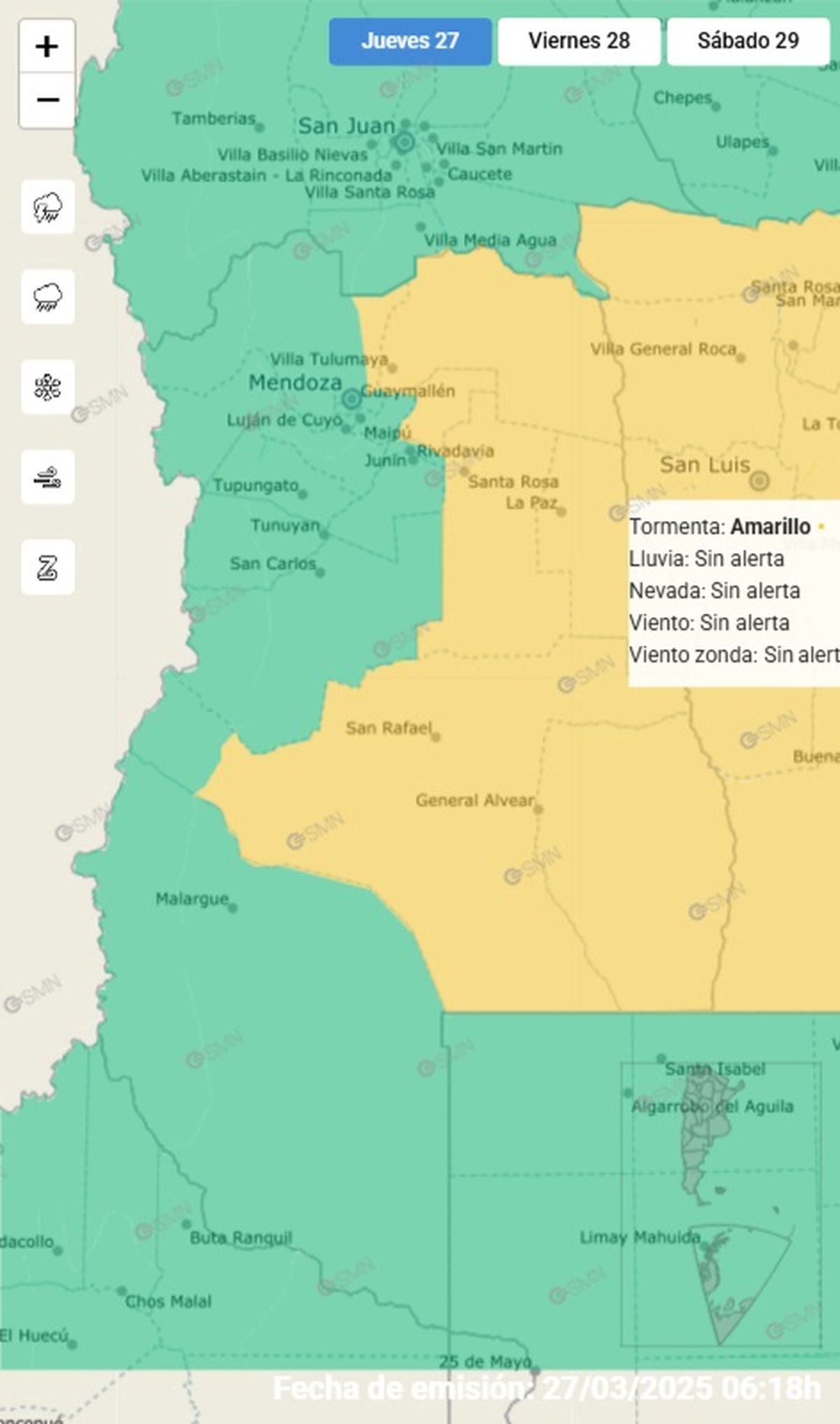 El Servicio Meteorológico Nacional ha emitido un alerta amarillo para la mayoría de la provincia de Mendoza este jueves 27 de marzo. El área será afectada por tormentas, algunas localmente fuertes. Las mismas pueden estar acompañadas por actividad eléctrica, granizo, ráfagas superiores a 60 km/h y principalmente abundante caída de agua en cortos períodos. Se prevén valores de precipitación acumulada entre 20 y 40 mm, que pueden ser superados en forma puntual. Estas llegarán el jueves entre las 18:00 h y las 00:00 h.