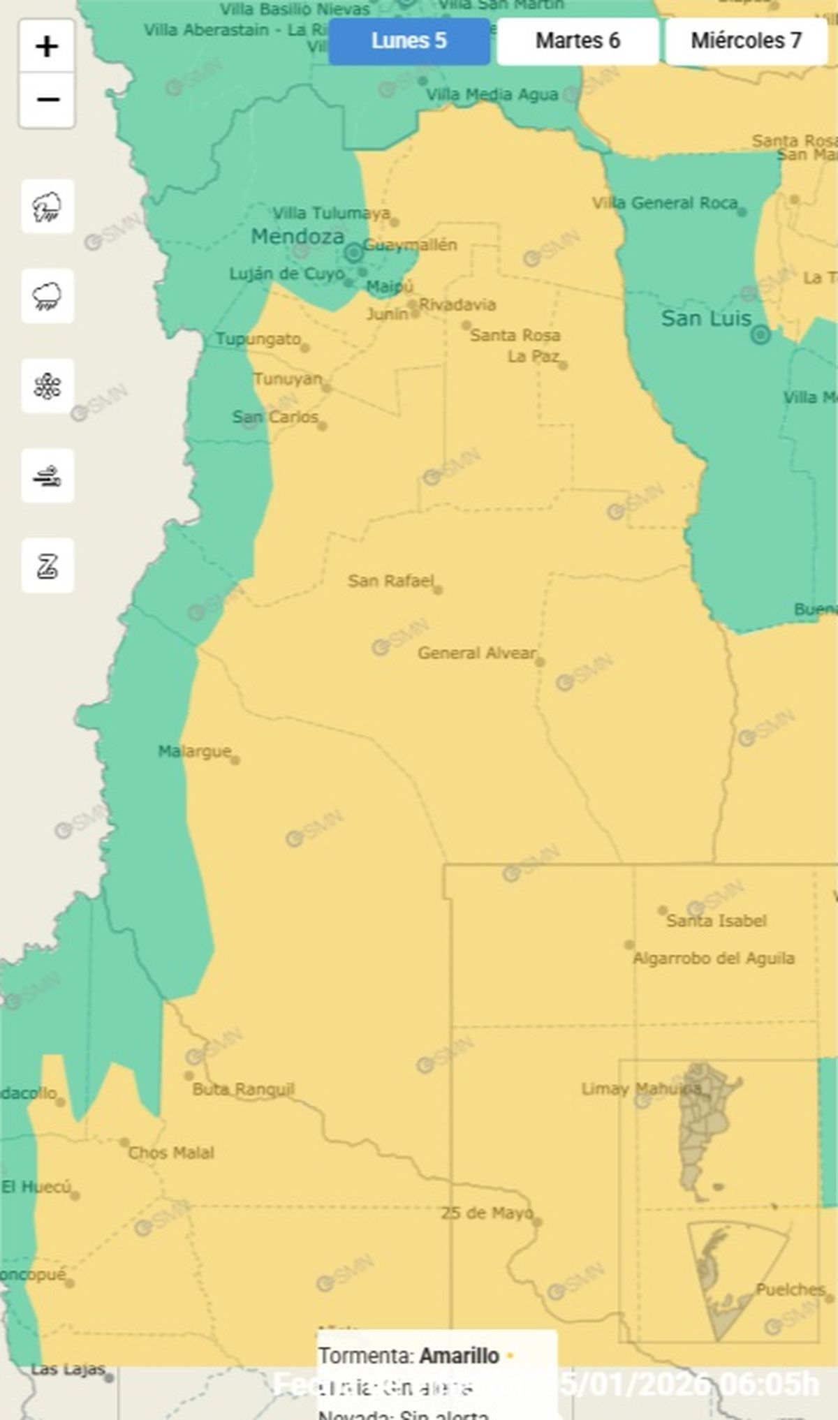 El Servicio Meteorológico Nacional (SMN) emitió un alerta por la llegada de fuertes tormentas en la provincia de Mendoza. El área será afectada tormentas aisladas de variada intensidad, algunas localmente fuertes. Las mismas podrán estar acompañadas por granizo, intensa actividad eléctrica, abundante precipitación en cortos períodos y ráfagas que pueden alcanzar los 70 km/h.