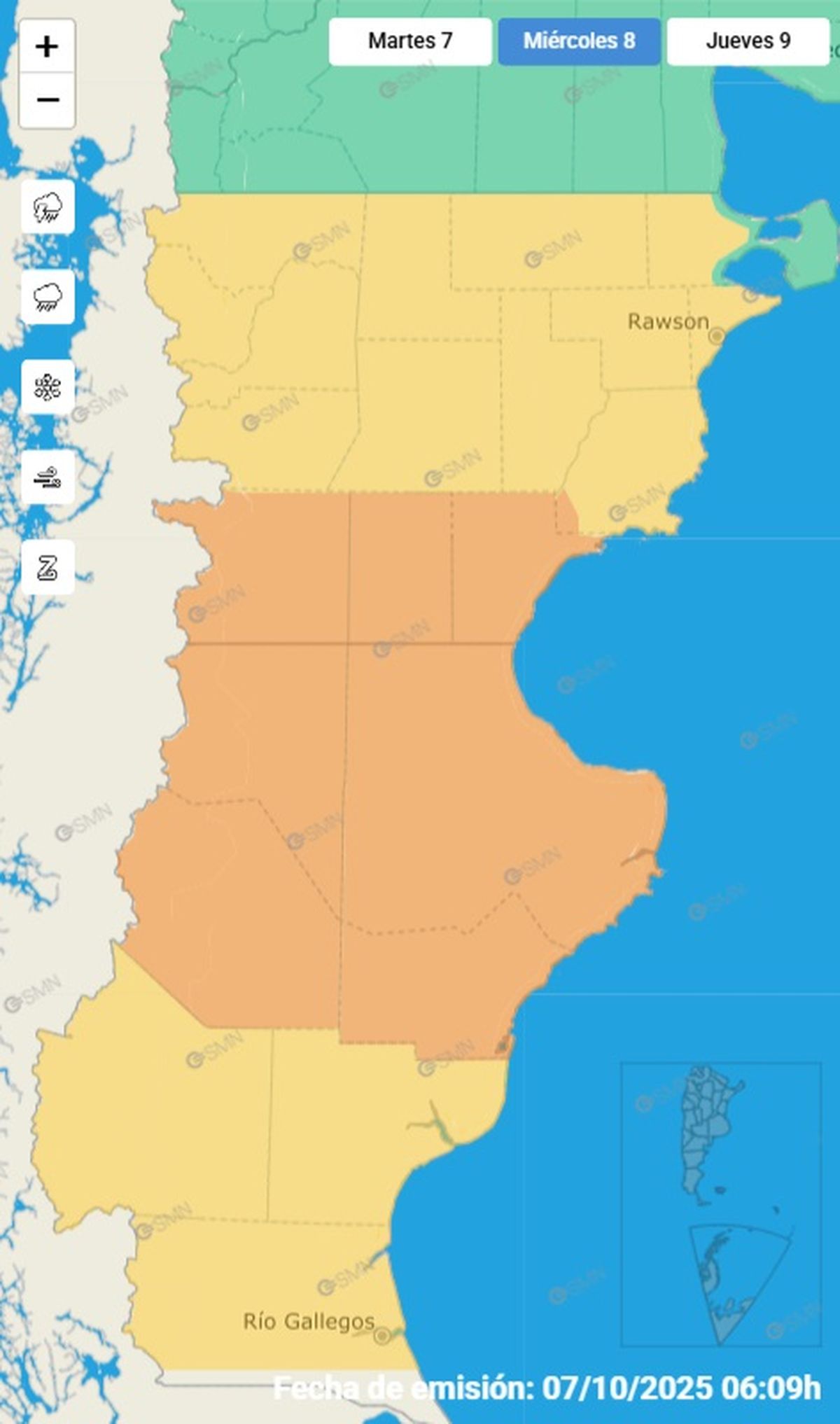 En cambio, el área será que se encuentra en alerta amarilla será afectada por vientos fuertes del sector oeste, con velocidades entre 40 y 60 km/h y ráfagas que pueden superar los 90 km/h.