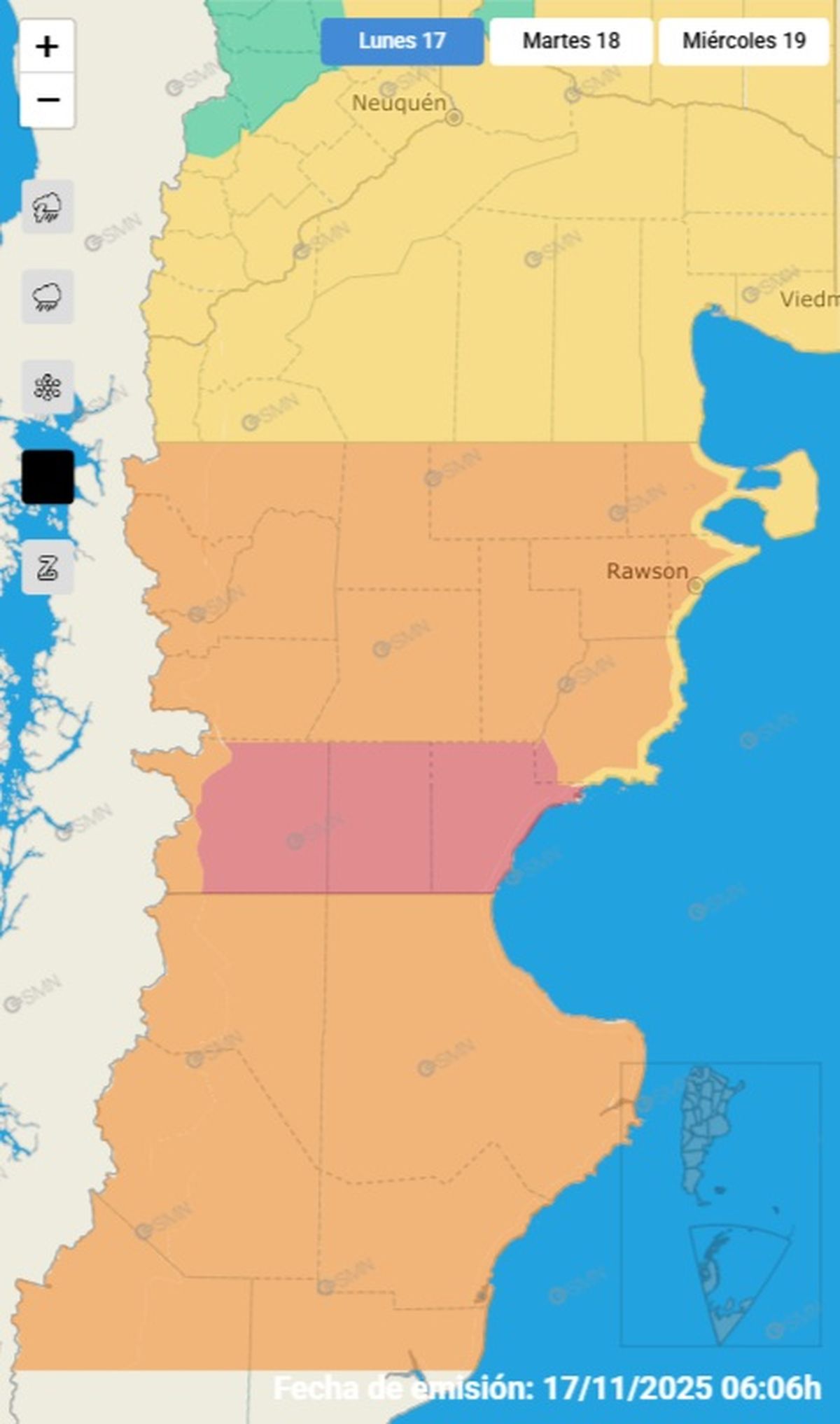 El Servicio Meteorológico Nacional emitió un alerta roja en la provincia de Chubut. El área será afectada por vientos del sector oeste con velocidades entre 60 y 90 km/h, con ráfagas que pueden superar los 140 km/h, las mayores intensidades se esperan cerca el medio día.