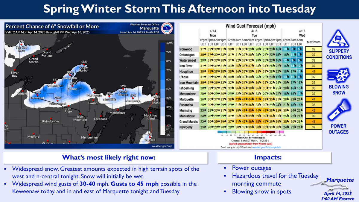 - Condados de Keweenaw, Ontonagon, Norte de Houghton, Gogebic y Sur de Houghton: La advertencia estará vigente desde las 8 PM EDT (7 PM CDT) de hoy lunes 14 de abril hasta las 11 AM EDT (10 AM CDT) del martes 15 de abril. Esta zona incluye las ciudades de Ontonagon, Kenton, Hancock, Ironwood, Copper Harbor, Sidnaw y Houghton.
