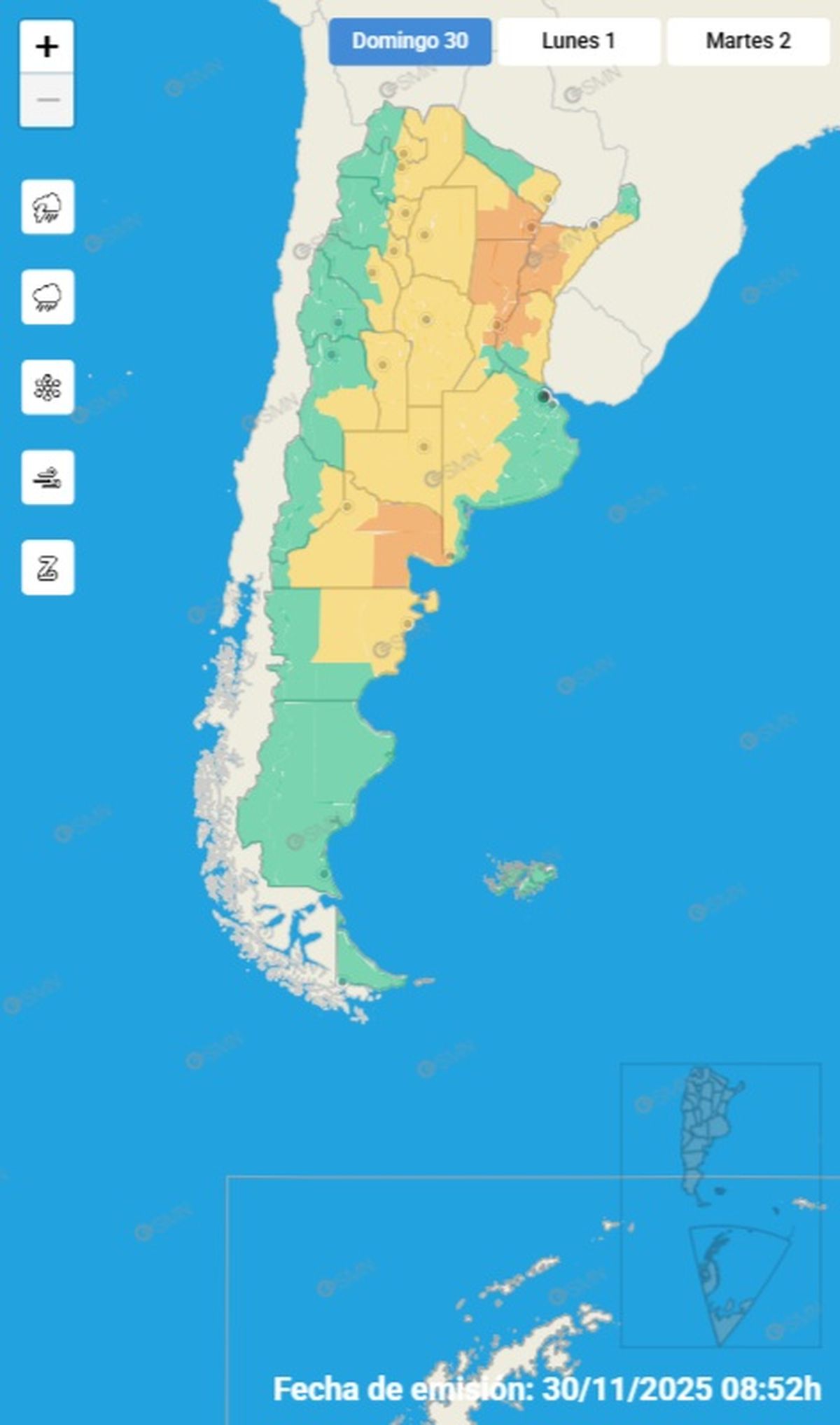 El área será afectada por tormentas fuertes o localmente severas. Las mismas podrán provocar principalmente abundante caída de agua en cortos períodos, además de actividad eléctrica frecuente, ráfagas que pueden superar los 90 km/h y ocasional caída de granizo.