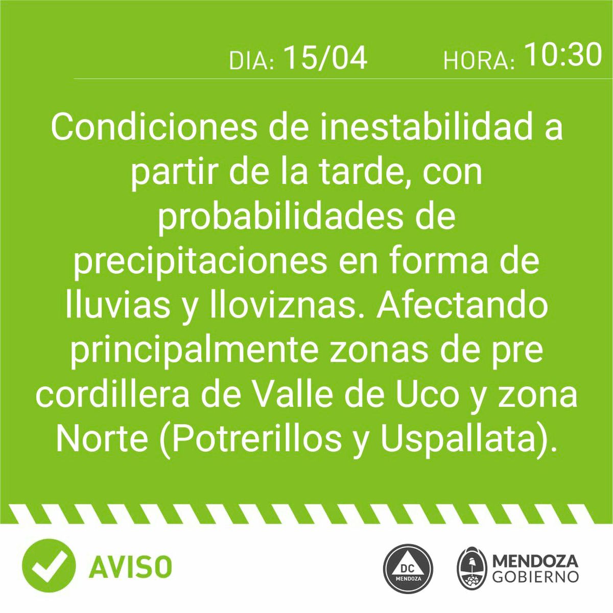"Condiciones de inestabilidad a partir de la tarde, con probabilidades de precipitaciones en forma de lluvias y lloviznas. Afectando principalmente zonas de precordillera de Valle de Uco y Zona Norte (Uspallata y Potrerillos)", detalla el alerta meteorológica de Defensa Civil.