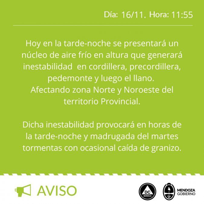 Defensa Civil de Mendoza emitió un alerta que incluye tormentas con caída de granizo. El anuncio llega después de unos días de la tormenta que provocó la muerte de un adolescente, derrumbes en casas y el anegamiento de viviendas, más cortes de luz y de agua en el Gran Mendoza.