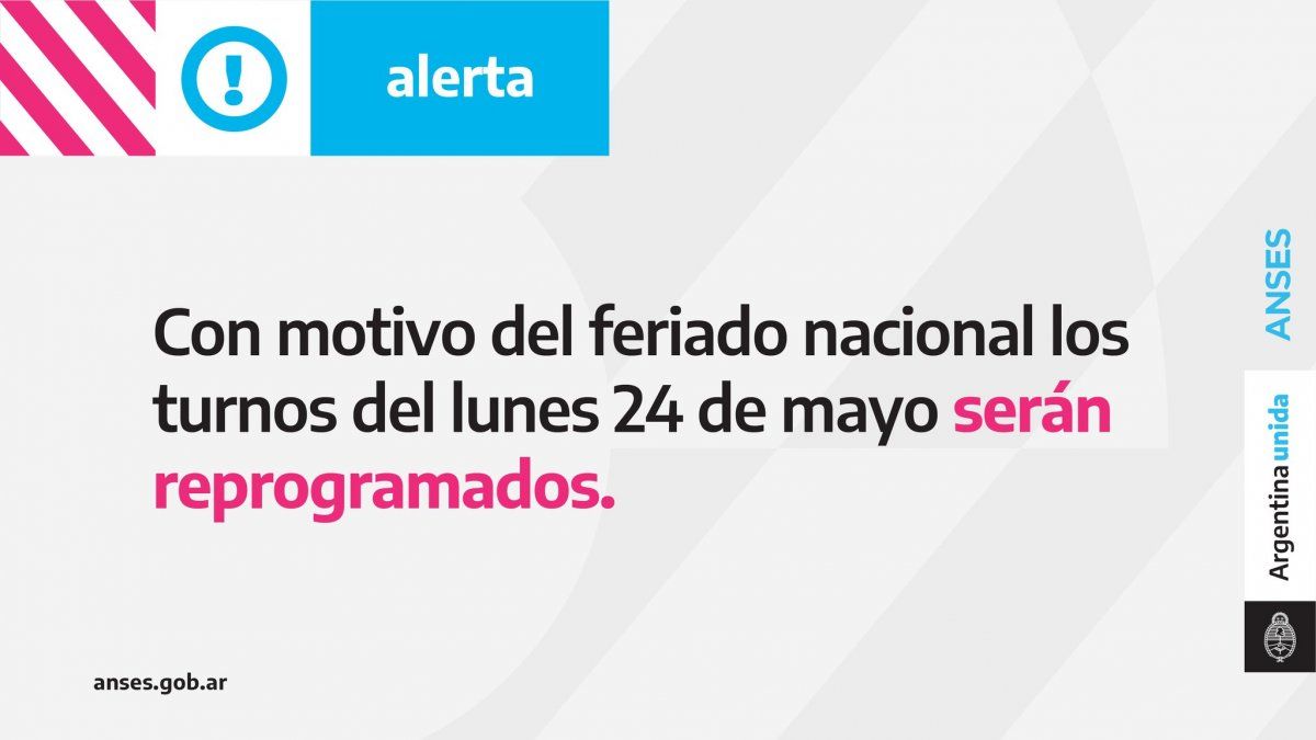 La ANSES (Administración Nacional de la Seguridad Social) comunicó en sus redes sociales que los turnos programados para el lunes 24 de mayo serán reprogramados por el feriado nacional.