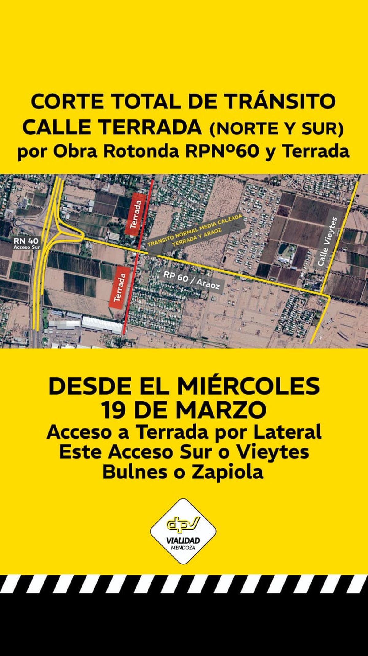 La Dirección Provincial del Vialidad informó este miércoles que habrá un corte total de tránsito en calle Terrada y Ruta 60 por la construcción de una rotonda. La obra demandará dos meses.