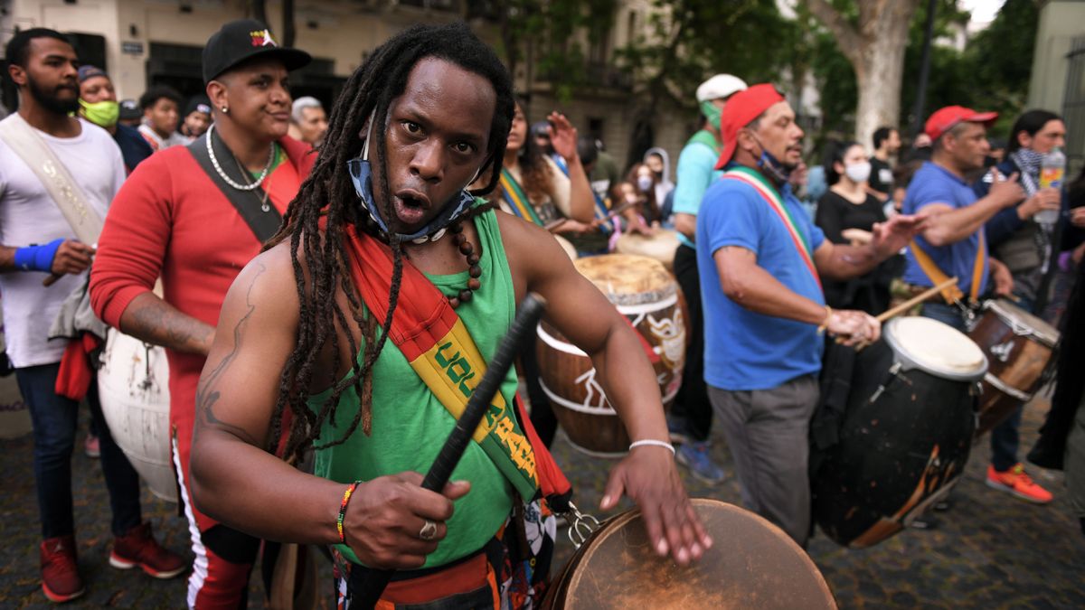 Afrodescendientes autoconvocados realizaron este domingo, en la Plaza Dorrego del barrio porteño de San Telmo, una tradicional llamada de candombe, esta vez con distanciamiento social, tapabocas y alcohol en gel, para visibilizar que Argentina "continúa siendo un país racista", en la previa a la conmemoración, mañana, del Día del Respeto a la Diversidad Cultural.