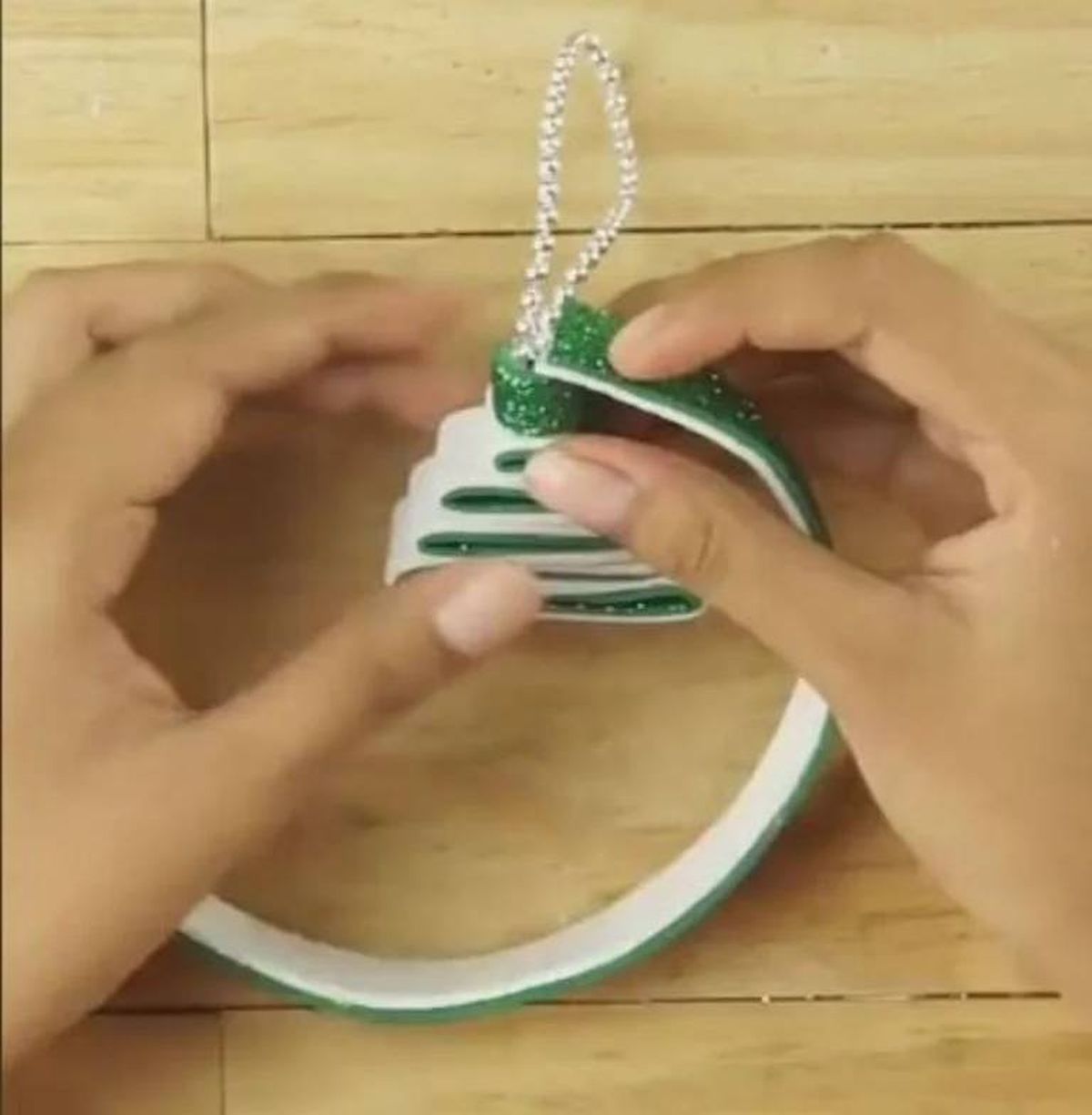 Luego toma una tira de cordón y pégasela en la punta del pinito, esto será de donde se colgará la esfera navideña. Después vuelve a tomar dos tiras de goma eva de ambos colores, vuélvelas a unir de modo que quede una tira y pega un extremo en la parte superior del pino, rodea todo el arbolito creando un círculo y termina pegando la otra punta de la tira en la parte de arriba del arbolito.