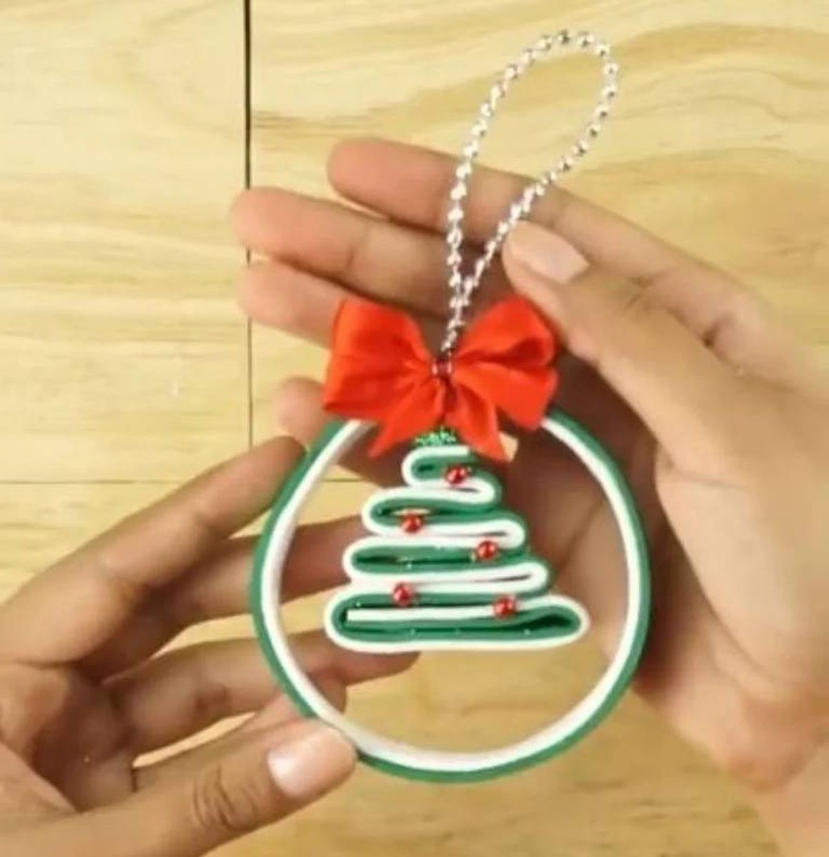De esta manera, se le dará la forma de esfera. Para terminar pégale pelotitas rojas que se verán como mini esferas navideñas y con un poco de cinta bebé color roja, arma un moño y agrégaselo.