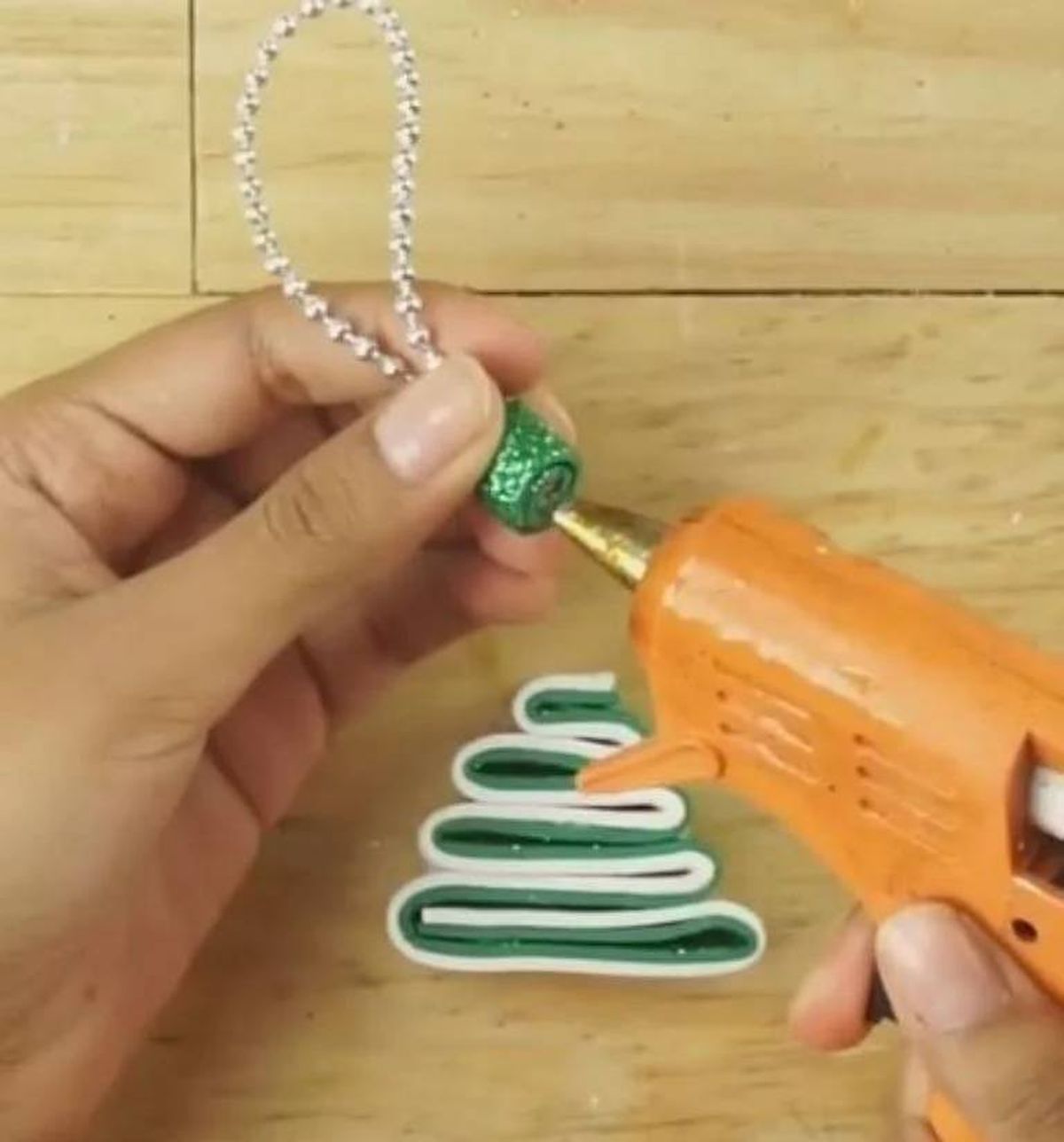 Después empieza a "enrollar" la tira verde y blanca dándole la forma de arbolito de Navidad, asegurándote de pegar cada tanto la goma eva para que la forma se mantenga.