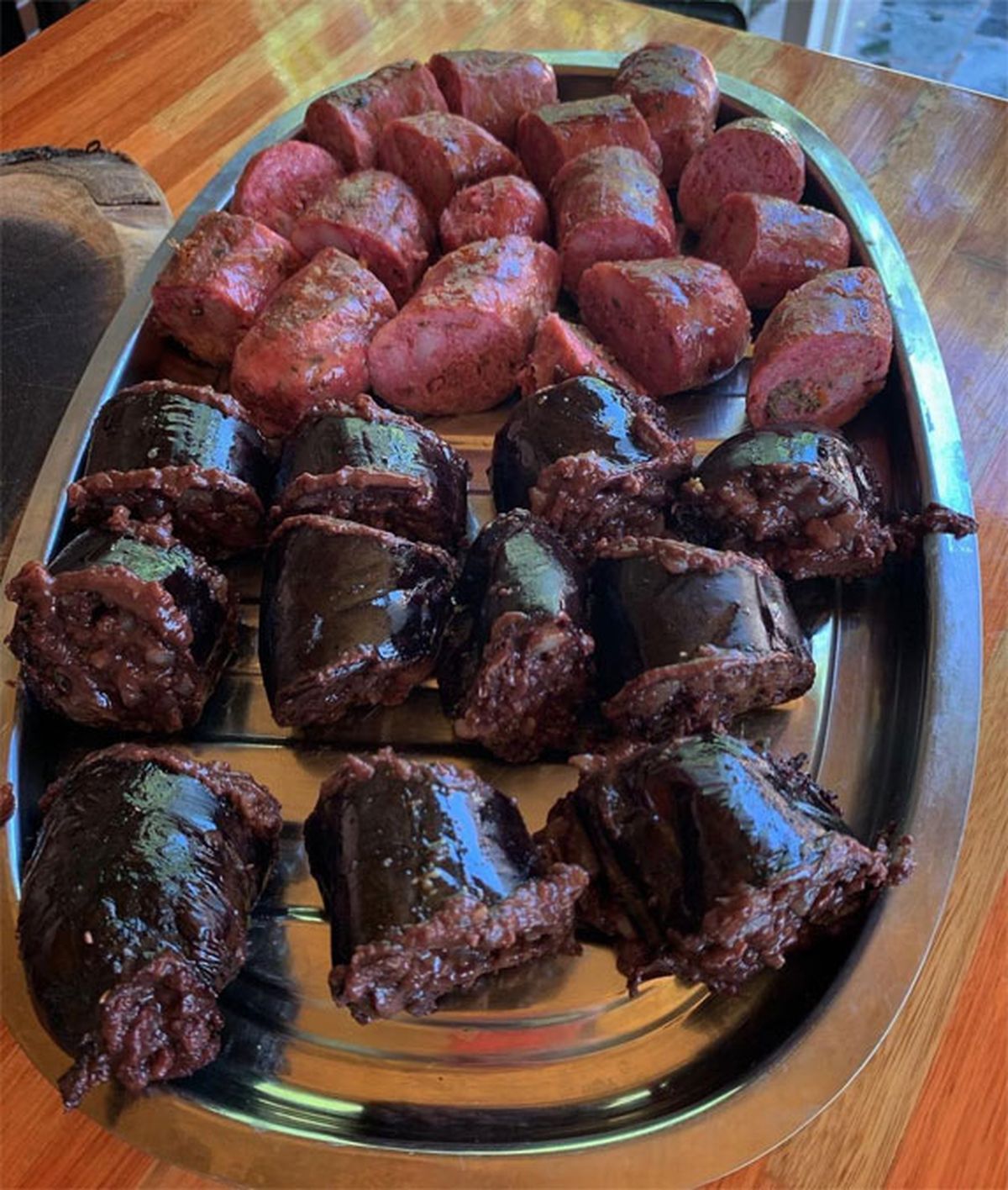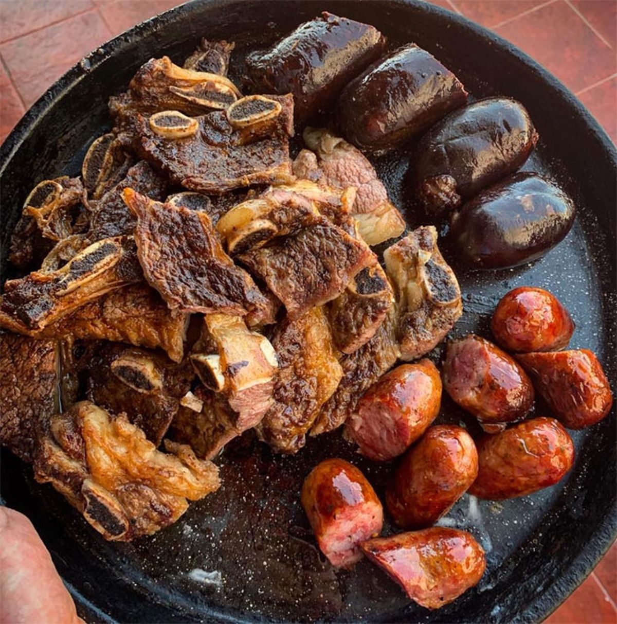 - Para evitar que la morcilla se cocine demás y se explote en la parrilla, lo ideal es dejarla en un rincón y sin brasas (ya vienen cocidas), para luego llevarla al fuego directo cuando resten 5 minutos para servir, para lograr esa consistencia crocante de la piel, que tanto les gusta a las personas.