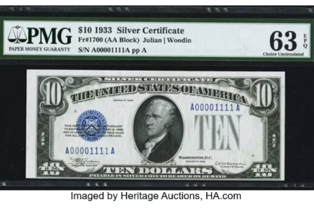 El billete de 10 dólares tan deseado por los coleccionistas de monedas y billetes no es difícil de reconocer. Tiene como fecha de impresión el año 1933 y se lo conoce como The King of Silvers. Según su historia, se fabricaron 216 mil ejemplares, de los que entraron en circulación un total de 156 mil. Hoy son pocos los que quedan de ellos.