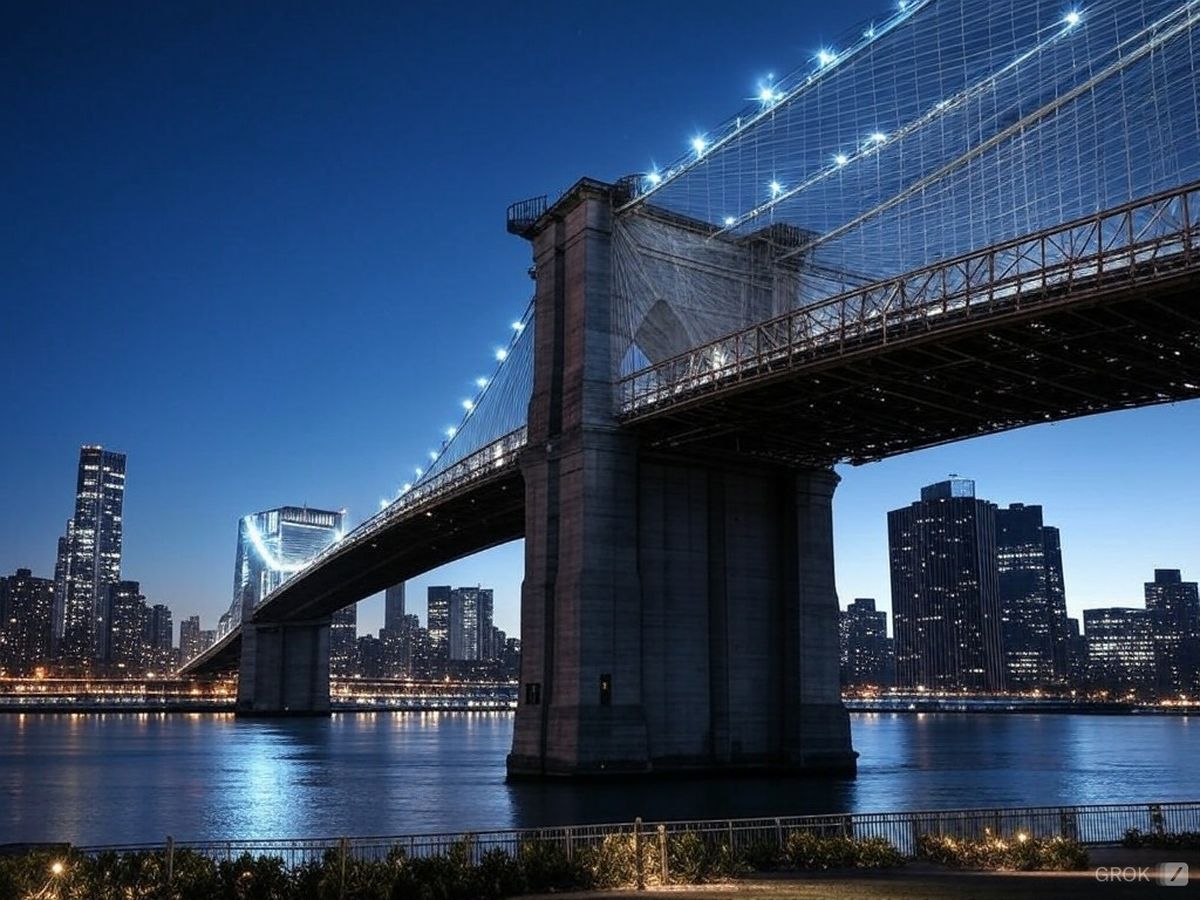 Uno de los lugares más significativos de Nueva York es el puente de Brooklyn y la inteligencia artificial de la red social X lo imaginó con un gran esplendor, iluminado y radiante. El puente fue construido en 1883 y conllevó 14 años de trabajos, con más de 600 trabajadores.