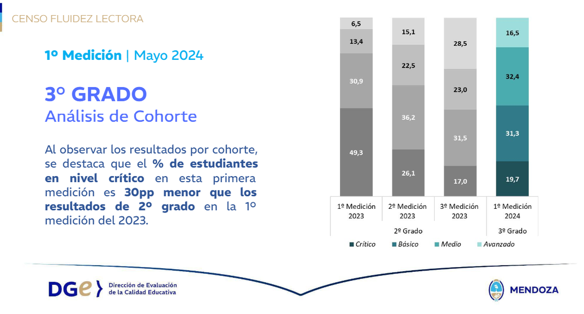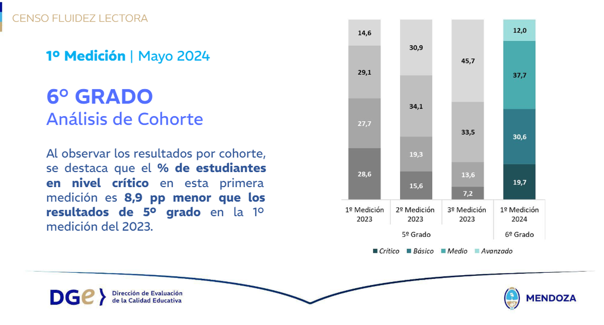 Comparando esta primera medición con la primera del año pasado -en los mismos alumnos- la DGE observó una mejora sustancial en el nivel crítico. Los chicos de tercero con ese grado de dificultad, que en 2023 fueron evaluados en segundo, fueron un 30% menos. Y en sexto, el porcentaje de estudiantes en nivel crítico en esta primera medición fue de 8,9 puntos menor que en los primeros resultados de quinto.