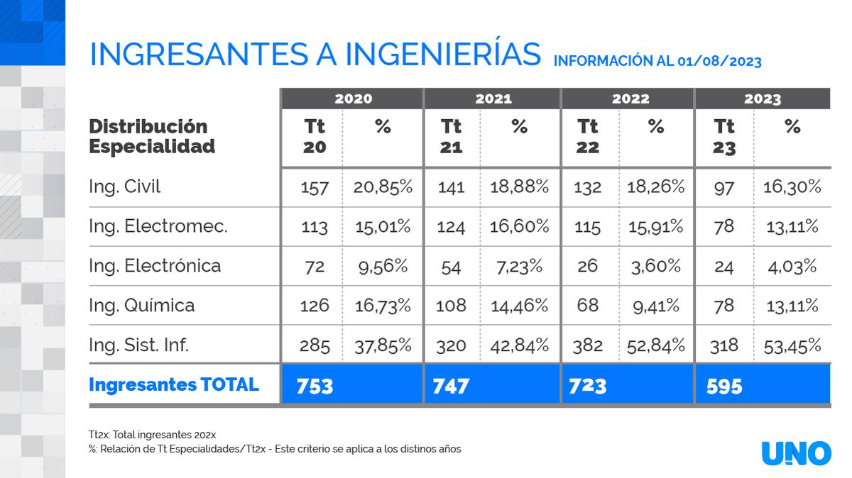 Pese a tener una salida laboral asegurada, la carrera de Ingeniería viene en declive en cantidad de alumnos, por lo menos en la UTN (Universidad Tecnológica Nacional Regional Mendoza), donde se ofrecen cinco ingenierías diferentes. Y de alrededor de 2.000 inscriptos cada año para el ingreso, sólo un 35% aproximado logra su cometido.