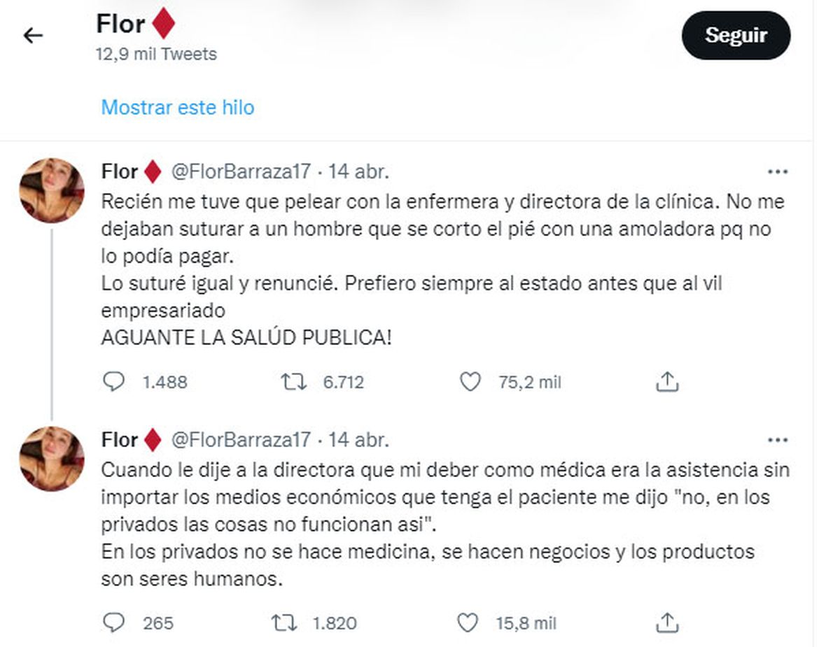 Barraza contó a través de Twitter la situación que le tocó vivir y se volvió viral en pocas horas. El posteo tuvo más de 75.000 likes y muchísimos retuits. En un corto hilo, la médica egresada de la Universidad del Salvador (Buenos Aires) detalló el enfrentamiento que tuvo con la enfermera y la directora de la clínica, tras el cual renunció.