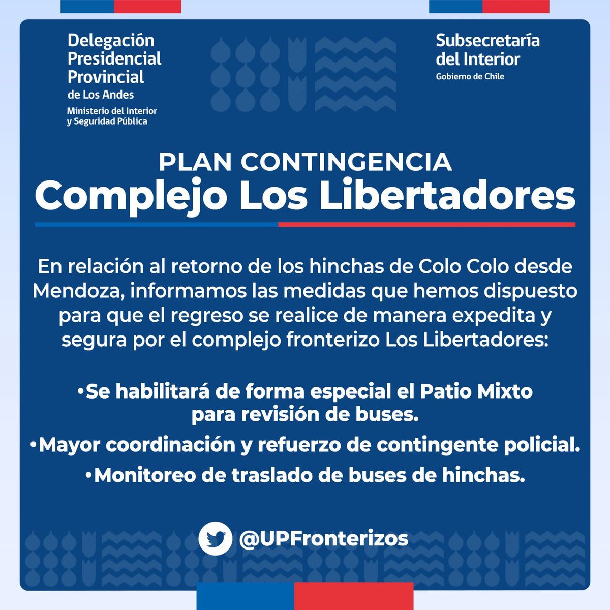 La Delegación presidencial provincial de Los Andes y la Subsecretaría del Interior de Chile informaron que ante la llegada de más de 40 micros con hinchas del Colo Colo que regresan a su país, montaron un operativo especial de control en Los Libertadores.