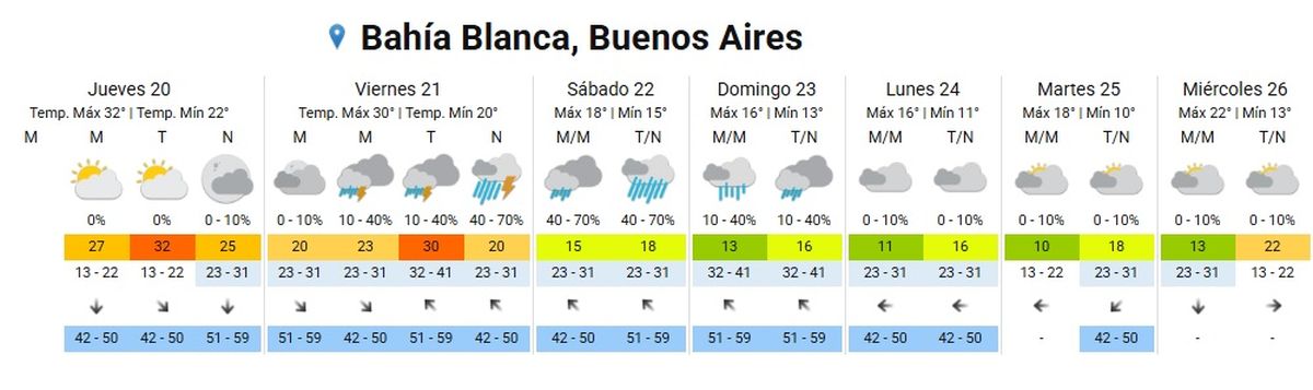 El Servicio Meteorológico Nacional emitió un alerta amarillo para gran parte de Buenos Aires, entre ellos, Bahía Blanca. El área será afectada por tormentas aisladas, algunas localmente fuertes. Las mismas estarán acompañadas por ráfagas que pueden superar los 70 km/h, ocasional granizo, intensa actividad eléctrica y abundante caída de agua en cortos períodos. Se prevén valores de precipitación acumulada entre 20 y 50 mm, pudiendo ser superados en forma puntual.