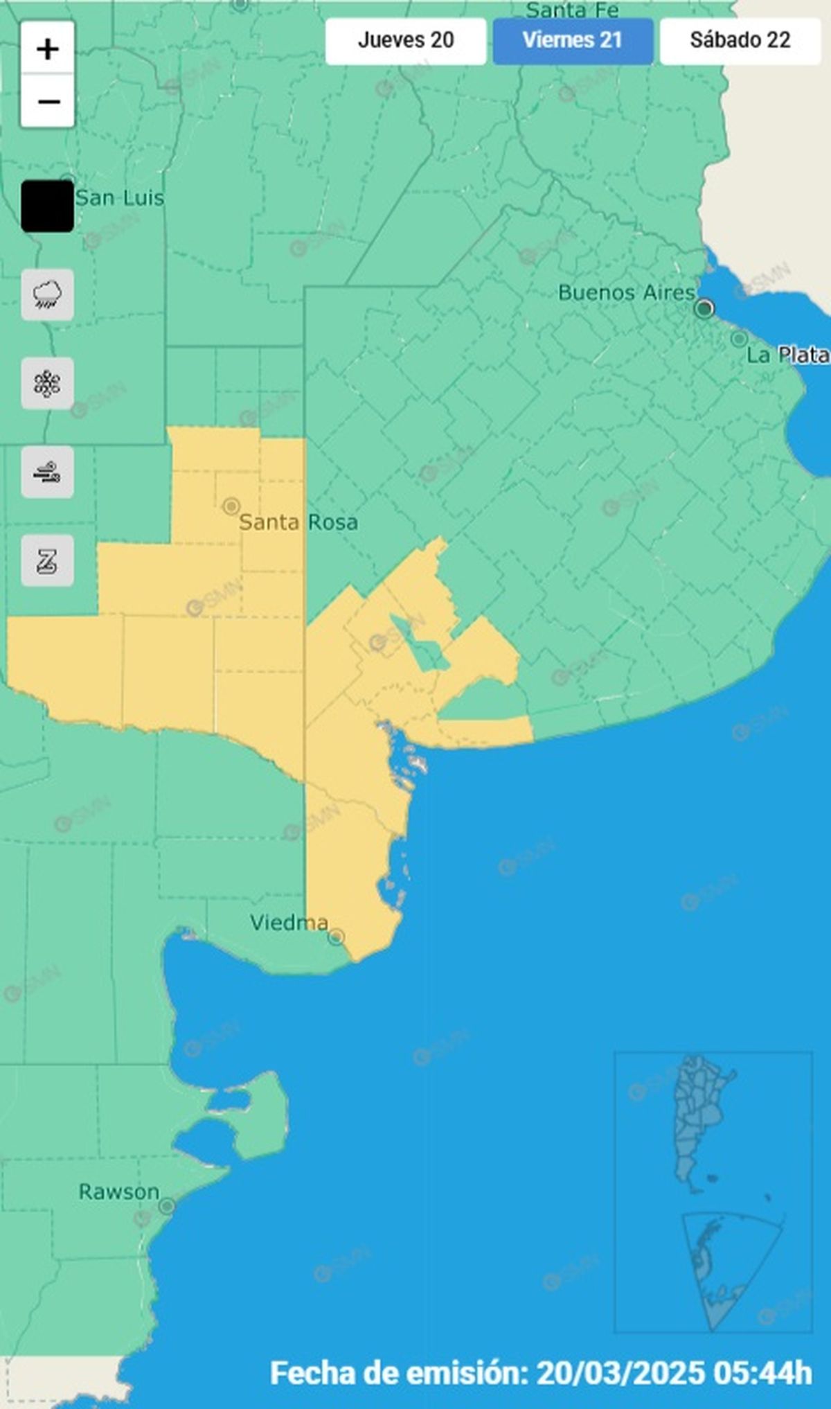 Además, el área será afectada por lluvias, algunas localmente intensas, con valores de precipitación acumulada entre 30 y 50 mm, pudiendo ser superados en forma puntual.