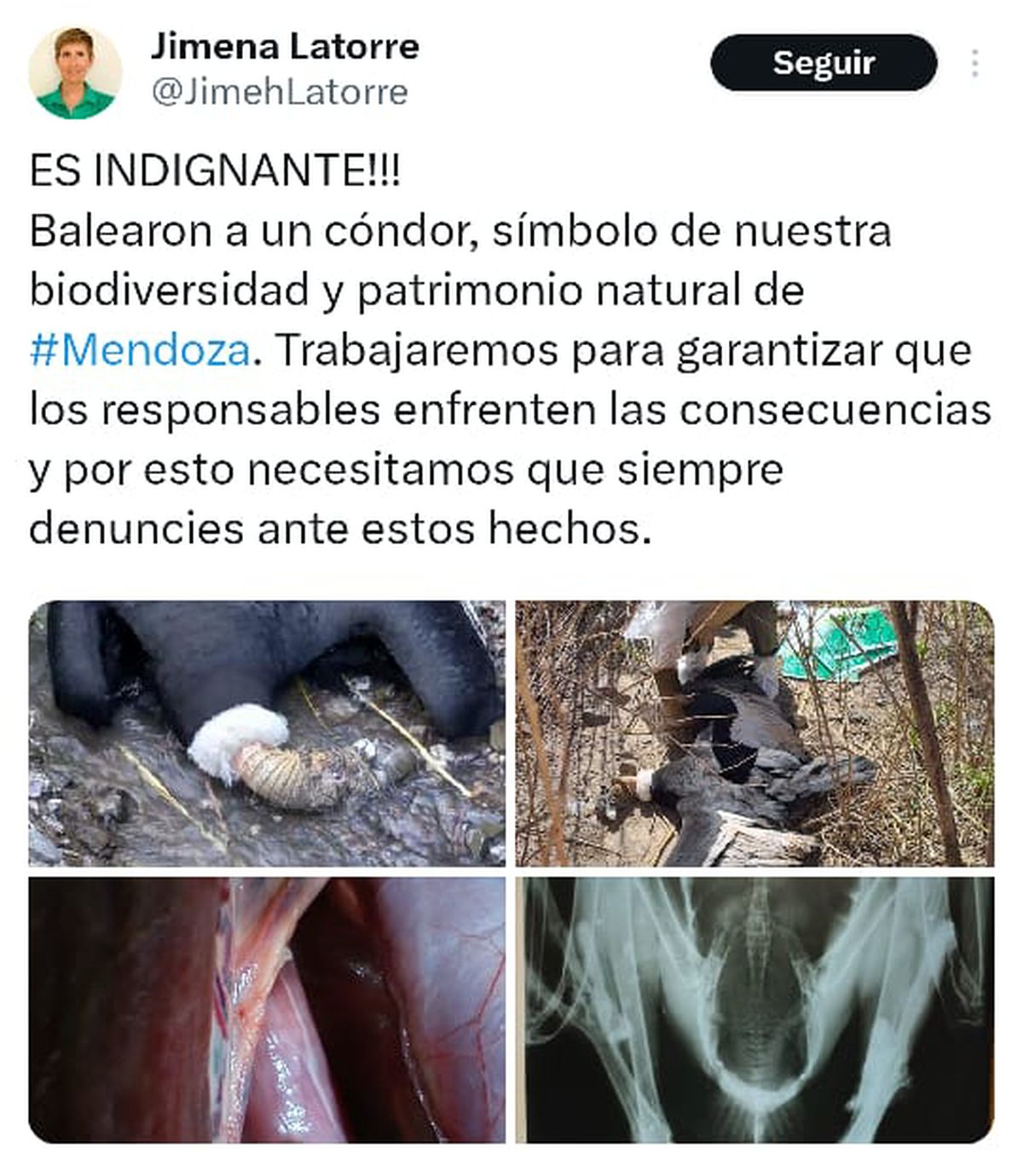 "ES INDIGNANTE!!! Balearon a un cóndor, símbolo de nuestra biodiversidad y patrimonio natural de #Mendoza. Trabajaremos para garantizar que los responsables enfrenten las consecuencias y por esto necesitamos que siempre denuncies ante estos hechos", escribió la funcionaria. Y detalló cómo sucedió el asesinato.
