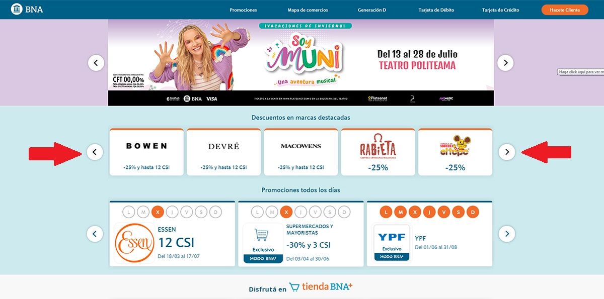 Una vez en el sitio, se desplegará la siguiente pantalla y se podrá ver qué negocios están adheridos y qué promoción ofrecen (indicados por las flechas rojas).