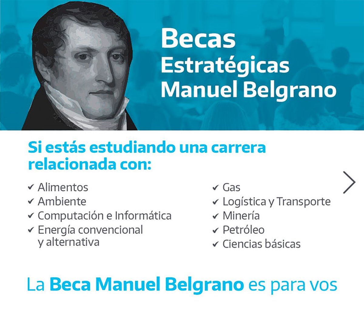 Las Becas Manuel Belgrano están destinadas a los estudiantes de nacionalidad argentina que, además de cumplir con lo requerido el Ministerio de Capital Humano, se hayan inscripto en una universidad pública nacional o provincial, en alguna de las carreras establecidas en la convocatoria.