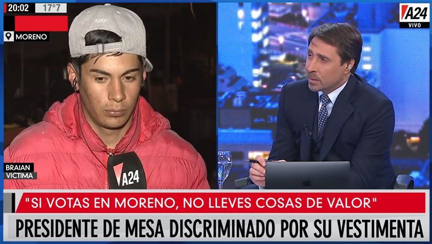 Su foto se viralizó en las redes con leyendas vergonzosas, hirientes y estigmatizantes. Braian Gallo presidió una mesa en las elecciones presidenciales de este domingo y muchos internautas compartieron la imagen con leyendas como "Dame el DNI y el celu también". El joven habló con el canal A24 y dejó en claro varias cosas.