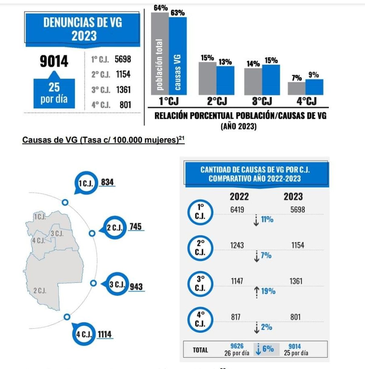 En la provincia, por circunscripción una radiografía que elaboró el Ministerio Público Fiscal se observa que la región en la que se produce el mayor número de causas es en el conglomerado del Gran Mendoza, junto a Lavalle con 6.419 en 2023 y 5.698 en 2023.