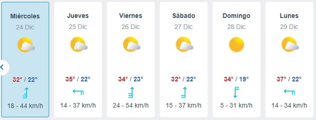 Para el día siguiente, el día 25 de diciembre, se pronóstica una temperatura máxima de 35 °C y una mínima de 22 °C. El resto de la semana se mantendrá en las mismas condiciones, exceptuando el lunes 29 de diciembre, que se espera una máxima de 37 ° C.