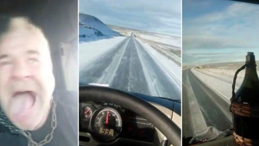 El video continúa. Mokfalvi enfoca el velocímetro: 83 kilómetros. ”¡Vamos, Renolito!”, se arenga a sí mismo y pisa el acelerador. La velocidad escala a 95 y “Renolito” no lleva puesto el cinturón de seguridad. “Siempre, siempre sin cadenas; pero con cadena líquida”, comenta y muestra una damajuana llena de vino, que exhibe como un trofeo.
