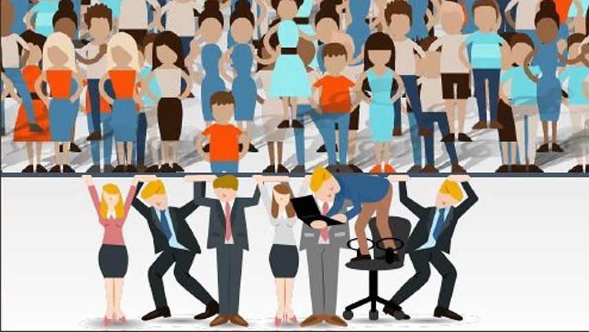 Para graficar que “hoy un 20 por ciento aportan el 99,4 por ciento de la recaudación”, el Ministerio de Producción y Trabajo difundió una presentación con un dibujo en el que se ve a siete personas rubias y bien vestidos sostienen a decenas de personas morochas, mayoritariamente mujeres.