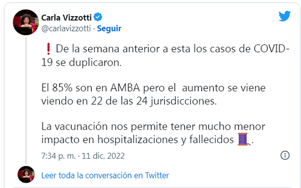 La ministra de Salud, Carla Vizzotti, confirmó que que los casos de Covid "se duplicaron" en una semana, mientras que reiteró que "reforzar la protección por vacunas es la clave" para enfrentar la pandemia y aseguró que "los refuerzos siguen siendo la mejor manera de prevenir hospitalizaciones y muertes".