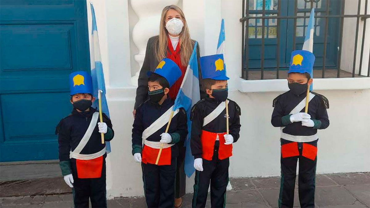 Lucas, Mirko, Tiziano y Juan Cruz pertenecen al Instituto Peter Pan de la Ciudad de Tucumán y junto a su seño Elizabeth Juárez realizaron el acto por el 9 de julio de una manera muy diferente a los conocidos, pero original, ya que la pandemia del Covid no permite las aglomeraciones y los festejos en los colegios.