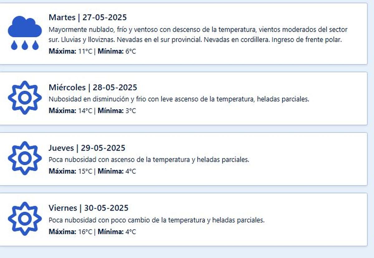 El miércoles disminuirá la nubosidad y el frío con un leve ascenso de la temperatura. Se espera una mínima de 3 grados y una máxima de 14 grados.