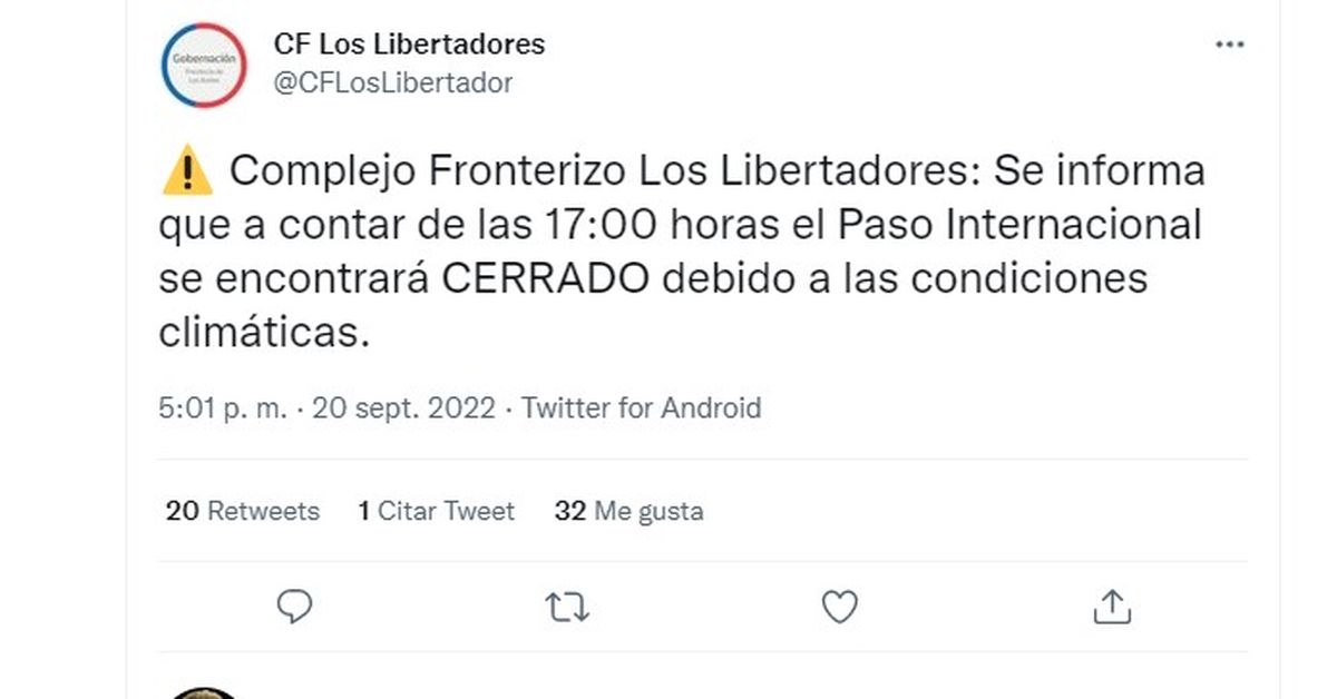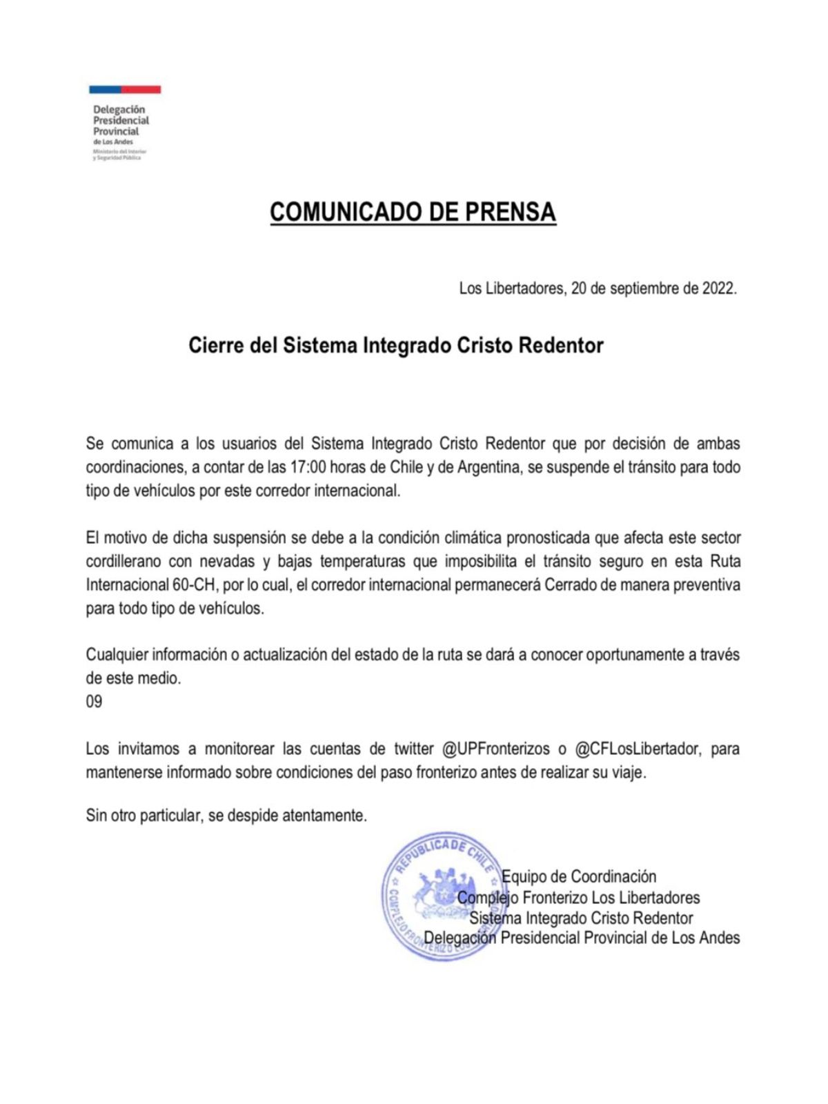 Según señala el comunicado emitido por la autoridad de los pasos fronterizos, en este caso del Paso Integrado Cristo Redentor, que une Mendoza con Los Andes, a través de la Ruta Nacional 7, de Argentina y la CH-60, de Chile, se realizó el cierre temporal, de manera preventiva del tránsito para todo tipo de vehículos a partir de las 17.