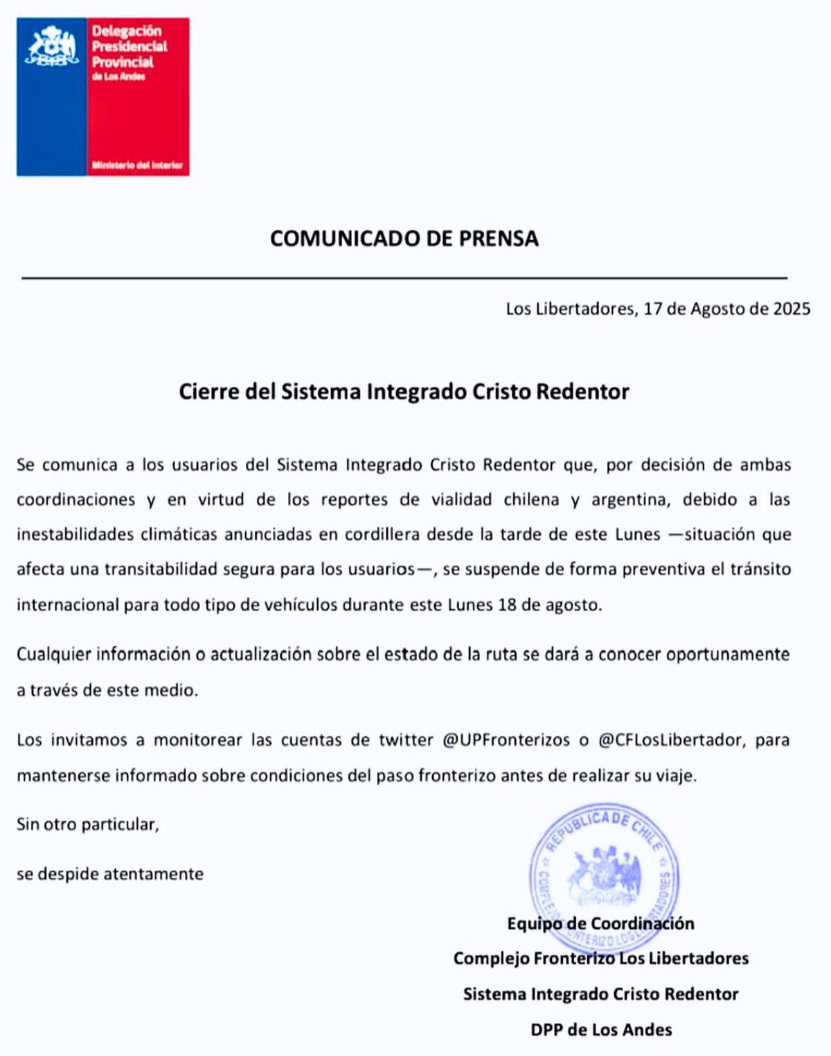 “Se comunica a los usuarios que durante toda la jornada del lunes 18 de agosto el Paso Internacional permanecerá cerrado preventivamente en ambos sentidos para todo tipo de vehículos”.