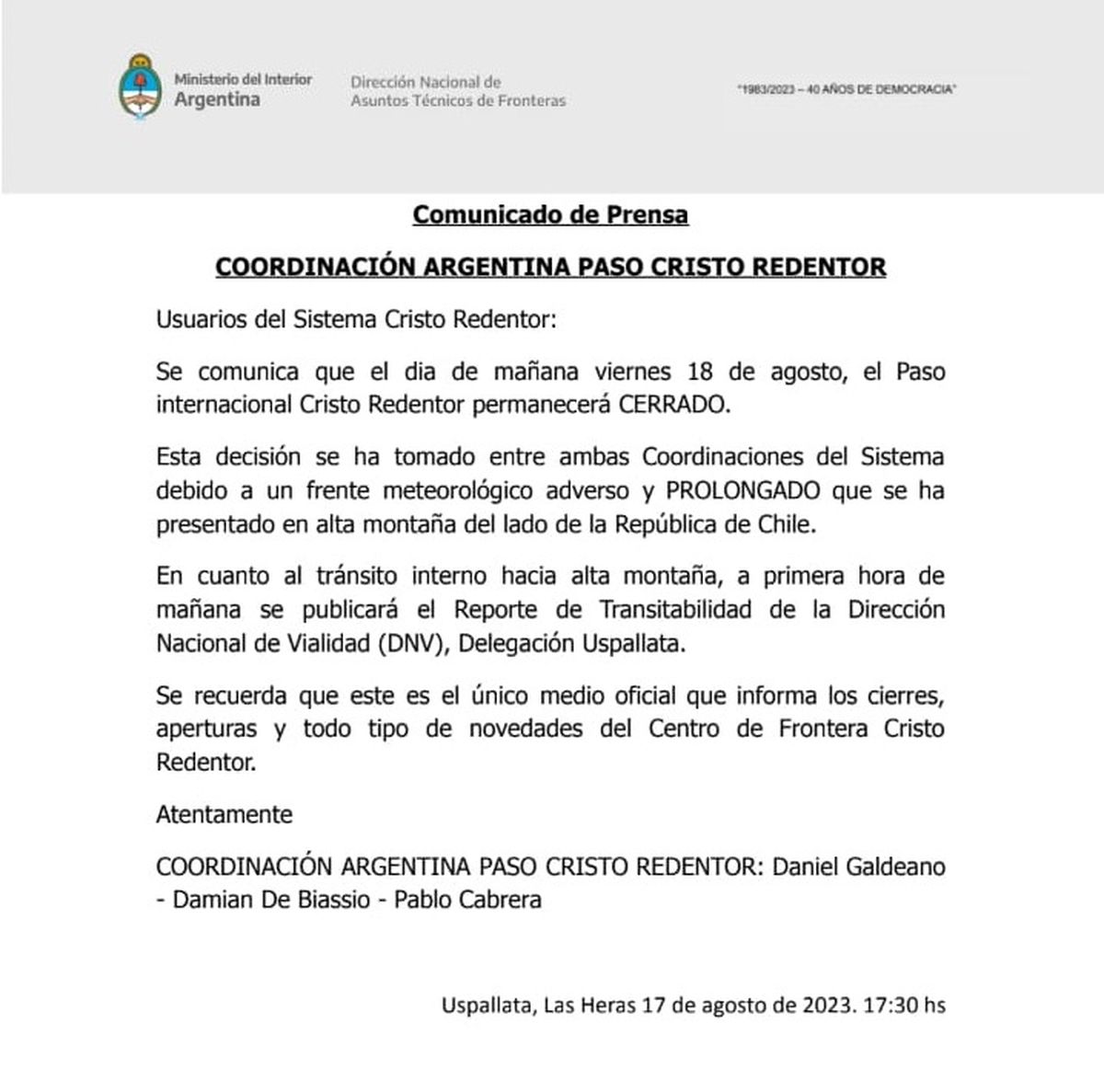 Las coordinaciones de Argentina y Chile acordaron que este viernes 18 de agosto el Paso Internacional Cristo Redentor permanezca cerrado.