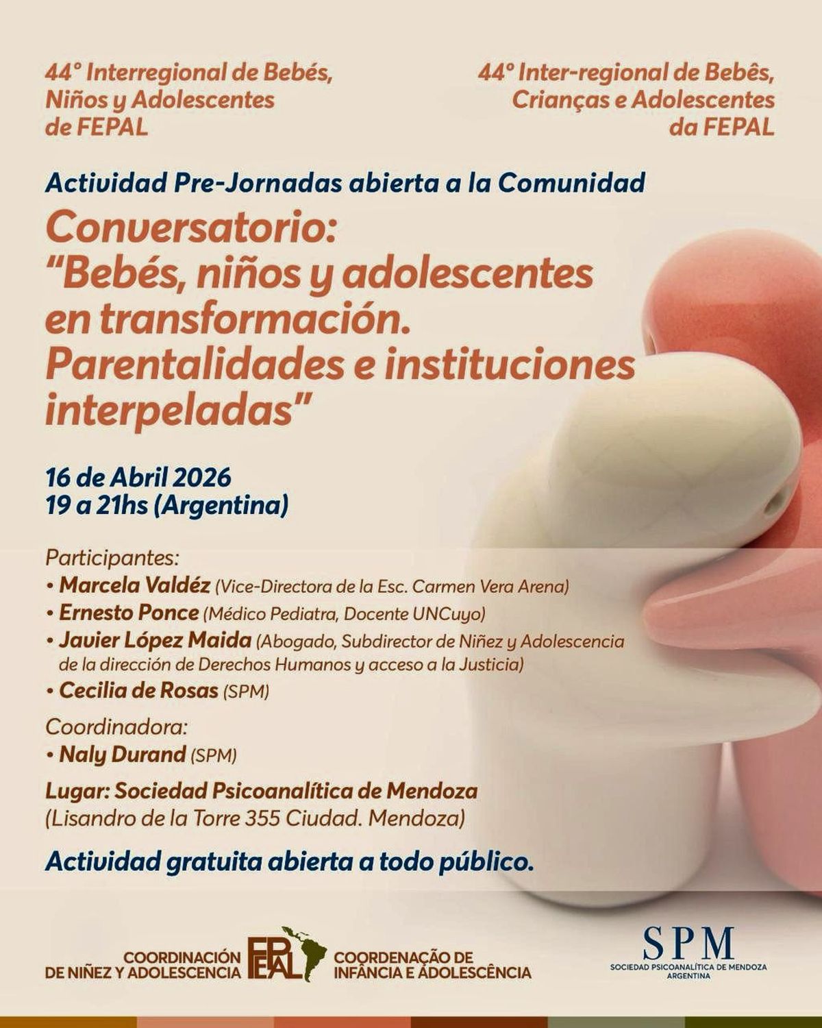 La propuesta toma forma en un conversatorio que se enmarca en el 44° Interregional de Bebés, Niños y Adolescentes de FEPAL, bajo el título “Bebés, niños y adolescentes en transformación. Parentalidades e instituciones interpeladas”. Allí se reúnen especialistas de distintas áreas junto a la comunidad para poner en común inquietudes, experiencias y miradas sobre los desafíos actuales.