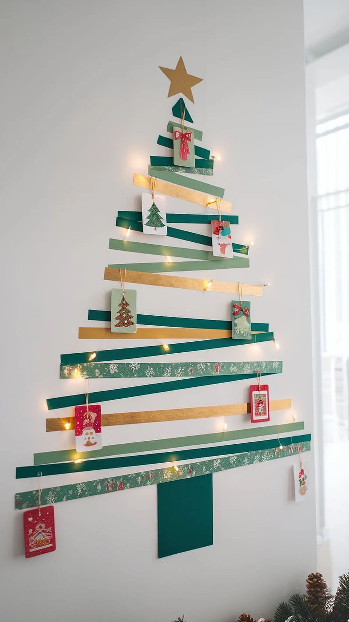 En vez de ramas y adornos voluminosos, se usa cinta adhesiva decorativa (washi tape) para dibujar sobre la pared la figura de un árbol. Se puede adornar con fotos, stickers o detalles hechos a mano: una opción económica, creativa y que personaliza el espacio.