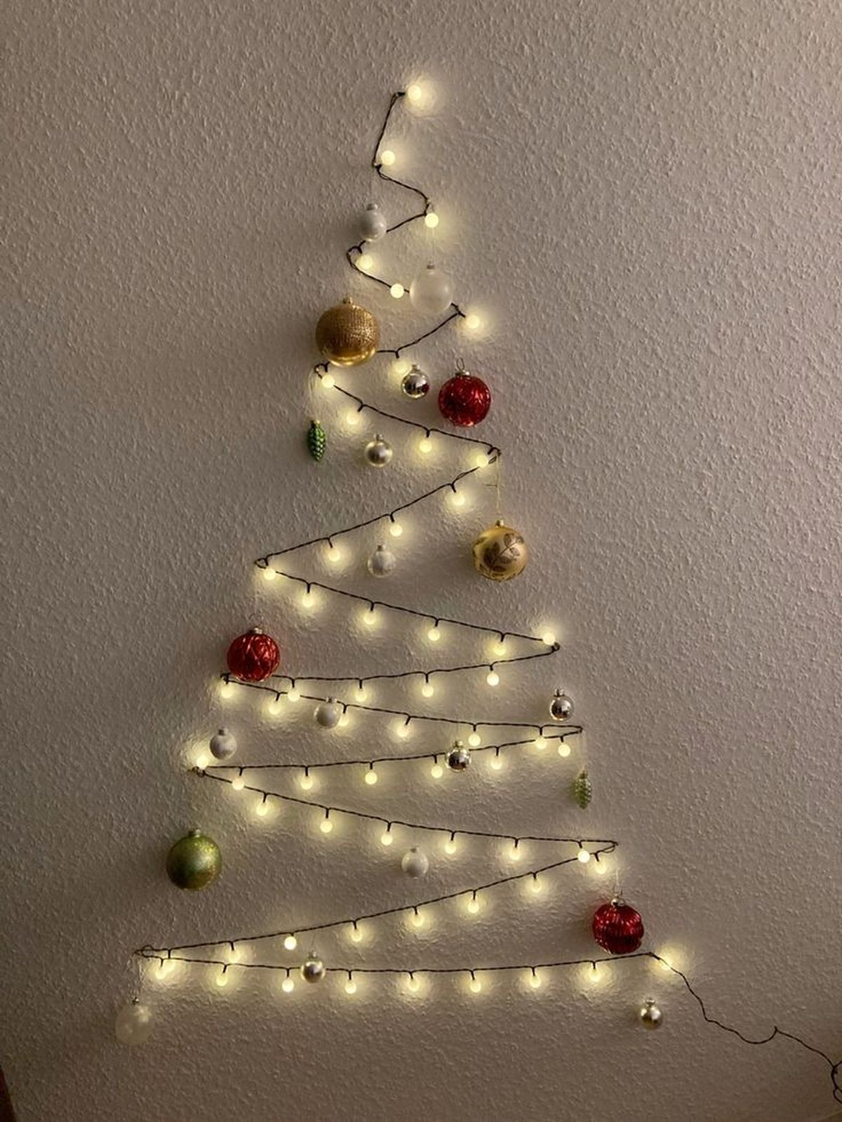 Para monoambientes o espacios reducidos, con un cable de luces largo y ganchos adhesivos armando un triángulo luminoso en la pared alcanza para recrear la forma de un árbol. Fácil de desmontar, perfecto si no querés lidiar con ramas ni agujas.